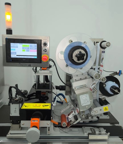 라벨 프린터를 장착, 라벨에 인쇄(유통기한, 성분, 일련번호, 데이터, QR코드 등)를 하여 제품에 붙이는 부착기입니다.